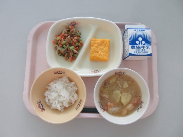 今日の給食は「ごはん たまご焼き きりざい 根菜のごまみそ煮 牛乳」です。