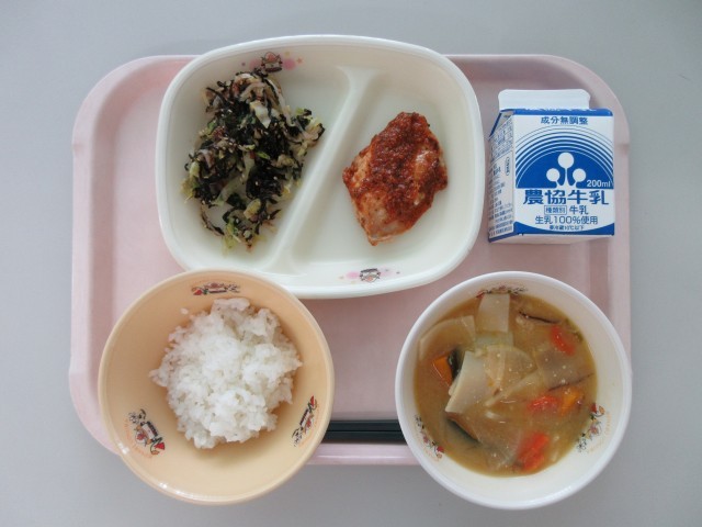今日の給食は「ごはん 鶏肉のバーベキューソース 磯和え ほうとう風汁 牛乳」です。