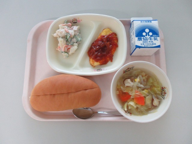 今日の給食は「背割りコッペパン オムレツトマトソース ポテトサラダ コーンと野菜のスープ」でした。