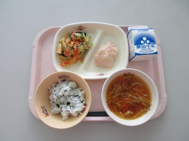 今日は「ごはん 鶏肉の甘ざけみそ焼き 大崎菜とツナの和え物 沢煮椀 牛乳 中のみお祝いクレープ」でした。