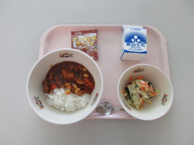 今日の給食は「ハヤシライス 青菜とツナのサラダ おさつチップス 牛乳」です。