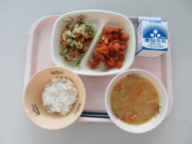 今日の給食は「ごはん 鶏チリ 塩昆布和え 中華風コーンスープ 牛乳」です。