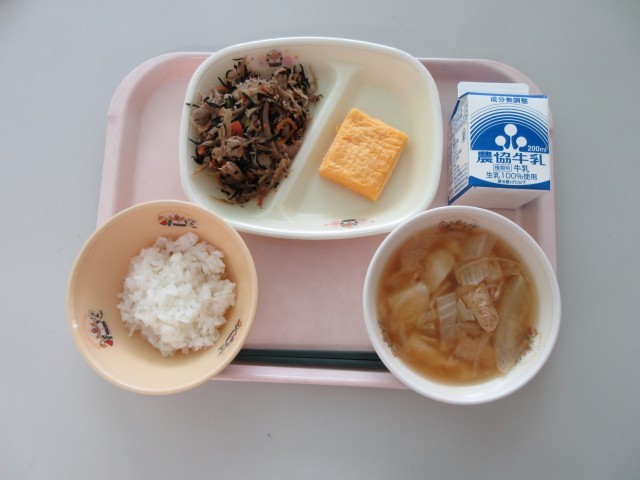 今日の給食は「ごはん 玉子焼き 豚肉の鉄骨炒め じゃがいもと白菜のみそ汁 牛乳」です。