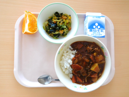 2月22日の給食は、「牛乳、わかめと大豆のサラダ、ハヤシライス(麦ごはん)、せとか」でした。