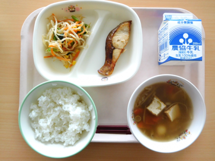 3月8日の給食は、「ごはん、牛乳、銀ヒラスのつけやき、三色おひたし、白玉けんちん」でした。