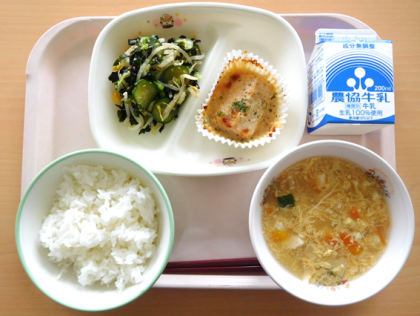6月6日の給食は、「ごはん、牛乳、鮭のチーズ焼き、キャベツとわかめのサラダ、たまごスープ」でした。