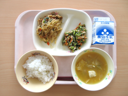 1月17日の給食は、「ごはん、牛乳、きりざい、はるさめ中華炒め、かぼちゃのみそ汁」でした。