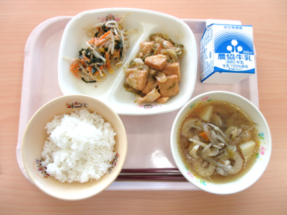 6月14日の給食は「ごはん、牛乳、厚揚げのホイコーロー風、わかめサラダ、鶏ごぼう汁」でした。