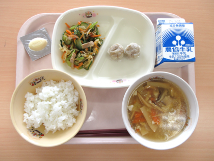 9月17日の給食は「ごはん、牛乳、しゅうまい、切り干し大根ナムル、豆腐スープ、型抜きチーズ(ラグビーボール)」でした。マラソンにバレーボールなど、テレビ観戦でスポーツの秋を実感しています。ラグビーワールドカップも20日からスタートします。がんばれ日本!