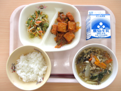 9月24日の給食は「ごはん、牛乳、豆腐チリ、ごまドレサラダ、春雨スープ」でした。