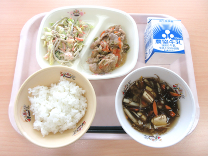 今日の給食は「ごはん、牛乳、豚肉のしょうが炒め、ごぼうのツナサラダ、もずくスープ」でした。今日は朝から雪が降り、寒さが身にしみます。給食では、しょうがは肉や魚などの臭みをとったり、隠し味として利用したりします。体をあたためるはたらきもあるので冬は活躍する食品です。