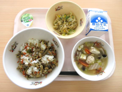 今日の給食は「ごはん、牛乳、深川めし(具)、ごまあえ、ちゃんこ汁、ミニ洋なしゼリー」でした。今日は給食週間4日目で、東京都の献立でした。深川めしの具をごはんに混ぜて食べました。ごまあえには、東京都の特産品の「こまつな」が入っています。城内小学校の1年生の教室に給食訪問へ行ってきました。あさりたっぷりの深川めしを、おいしいと言って、もりもり食べてくれました。配膳も上手にできていました。