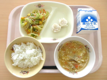 今日の給食は「ごはん、牛乳、えびしゅうまい、春雨サラダ、マーボーどうふ」でした。朝から寒い1日でしたが、マーボーどうふで体が温まったかと思います。春雨サラダは、城内小学校6年生のリクエストメニューでした。