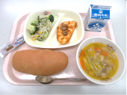 今日の給食は「コッペパン、キャラメルクリーム、牛乳、オムレツデミソース、フレンチサラダ、大根ポトフ」でした。今日のポトフには、大根をたくさん使っています。にんじんやキャベツ、ウインナーなども入っているので、甘味やうま味が溶けだしたおいしいポトフに仕上がりました。