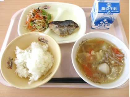 今日の給食は「ごはん、牛乳、さわらの西京焼き、たくあんあえ、けんちん汁」でした。今日から1年生の給食がスタートした小学校があります。さわらは春が旬の魚で、漢字では魚へんに春と書きます。皮がうすく小骨も少ないので子どもたちにもたべやすい魚です。