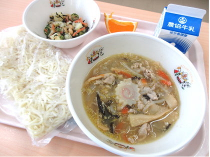 今日の給食は「ゆで中華めん、牛乳、みそラーメンスープ、鉄骨サラダ、オレンジ(清美)」でした。今日は今年度最初の麺の日でした。具だくさんのみそラーメンスープになりました。給食の麺は、つけめん風に食べるのですが、小学校の1年生は上手に食べられたでしょうか?