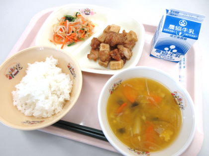 今日の給食は「ごはん、牛乳、鶏肉と高野豆腐の揚げ煮、たくあんあえ、かぼちゃのみそ汁」でした。高たんぱく低脂肪でヘルシーな高野豆腐は大豆から作られる食品です。家庭で食べる機会は少ないと思いますので、給食でよく味わってほしいです。