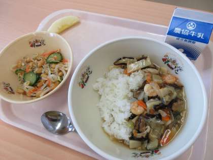 今日の給食は「牛乳、五目あんかけ丼(麦ごはん)、豆じゃこサラダ、りんご」でした。五目あんかけ丼に入れた白菜は、南魚沼産のものでした。とても立派な白菜でした。地域でとれた新鮮な野菜を使用できることがありがたいです。