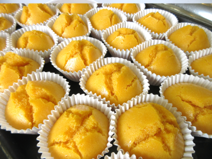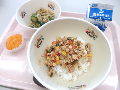 今日の給食は「ごはん、牛乳、ツナそぼろ丼の具、茎わかめのサラダ、春はあけぼの蒸しパン」でした。今日の春はあけぼの蒸しパンはセンターで手作りしたものです。写真のように春のあけぼのを連想させるような素敵な色にできあがりました。味はオレンジの香りがほんのり香る優しい味に仕上がりました。