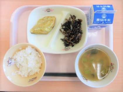 今日の給食は「ごはん、牛乳、さばのカレー焼き、ひじきの炒め煮、じゃがいものみそ汁」でした。さばはカレーの味付けがおいしく、ごはんが進みました。お天気もよくさわやかな一日でした。