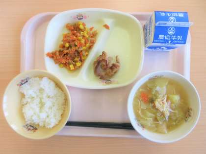 今日の給食は「ごはん、牛乳、照り焼きチキン、無限にんじん、春キャベツのみそ汁」でした。にんじんが苦手だな。という人も、無限にんじんならパクパク食べられます。特に、今の季節のにんじんは「雪下にんじん」を使っているので、甘味が増して、おいしいのです。