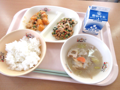 今日の給食は「ごはん、牛乳、きりざい、かぼちゃのそぼろ炒め、根菜汁」でした。 根...