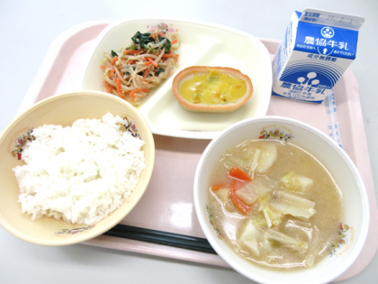 今日の給食は「ごはん、牛乳、まるごとグラタン、大崎菜のツナサラダ、白菜のみそ汁」...