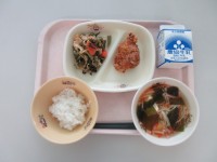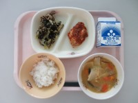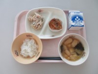今日の給食は「ごはん 厚揚げのねぎみそダレかけ のり酢和え のっぺ汁 牛乳」です...
