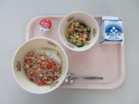 今日の給食は「もやしたっぷり丼 大豆と小松菜のサラダ ミニりんごゼリー 牛乳」で...