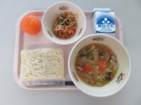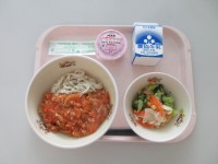 今日の給食は「ソフトめんミートソース フレンチサラダ いちごプリン 牛乳」です。...