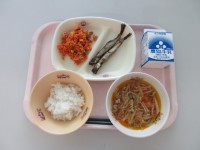 今日の給食は「ごはん ししゃものカレー風味焼き 無限にんじん 沢煮椀 牛乳」です...