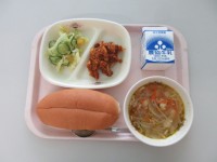 今日の給食は「背割れコッペパン チリドッグの具 夏みかんサラダ ジュリアンスープ...