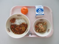 今日の給食は「チキンカレー 福神漬け 青大豆サラダ みかん 牛乳」です。今日は、...