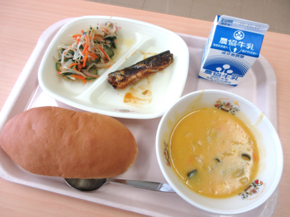 今日の給食は「ごはん、牛乳、イカのカレー焼き、大根きんぴら、里芋のみそ汁」でした...