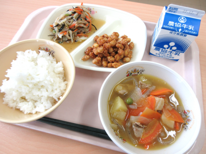 今日の給食は「ミートボールカレー(麦ごはん)、牛乳、豆カルサラダ、花みかん」でし...