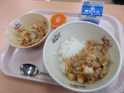 今日の給食は「マーボー豆腐丼、牛乳、切り干し大根サラダ、花みかん」でした。今日は...