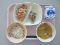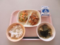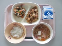 今日の給食は「ごはん 牛乳 じゃがいもの揚げ煮 のり酢和え うすくず汁」です。今...