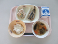 今日の給食は「ごはん ししゃものスパイシー焼き 磯マヨ和え おでん汁 牛乳」です...