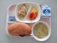今日の給食は「コッペパン ブルーベリージャム 牛乳 オムレツ・トマトソース コー...