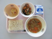 今日の給食は「けんちんうどん じゃこサラダ きなこ豆 牛乳」です。「きなこ豆」は...