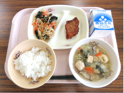 今日の給食は「ごはん、牛乳、カレイの竜田揚げ、切干大根ナムル、塩ちゃんこ汁」でし...