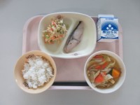 今日の献立は、「ごはん ホッケの塩焼き 和風マカロニサラダ たぬき汁 牛乳」でし...