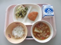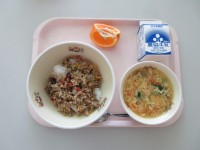 今日の給食は、「ごはん 生揚げのお好み焼き むげんにんじん ビーフンスープ 牛乳...