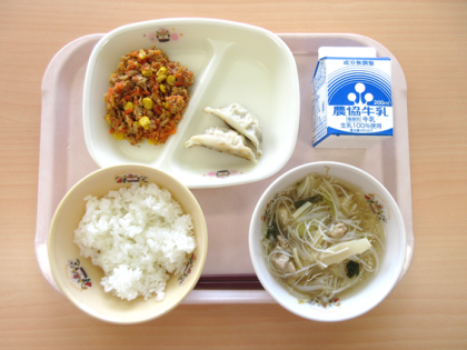 4月15日の給食は「ごはん、牛乳、焼きぎょうざ、むげんにんじん、ビーフンスープ」...