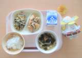 6月8日の給食は、「牛乳、ごはん、鶏肉の唐揚げ、切り干し大根のナムル、あさりのみ...