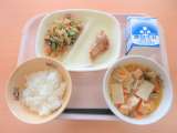 今日の給食は「ごはん、牛乳、鶏肉のピリッと焼き、じゃこキャベツ、みそワンタンスー...