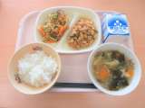 今日の給食は「ごはん、牛乳、鉄火みそ炒め、もやしサラダ、うすくず汁」でした。鉄火...
