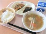 今日の給食は「牛乳、ごはん、鉄火みそ炒め、こまつなサラダ、つみれ汁」でした。つみ...