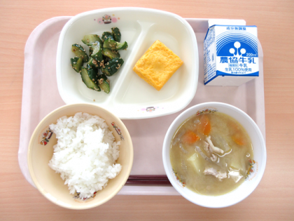 7月2日の給食は「ごはん、牛乳、厚焼き卵、ピリ辛きゅうり、豚汁」でした。大量のき...