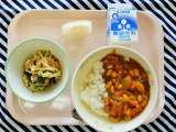 今日の給食は「ごはん、牛乳、手作り麩のカツ、大豆と小松菜のサラダ、カレースープ」...